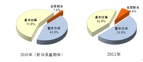评价显示,2011年,全省61个按一级财政体制结算的县(市、区)统筹城乡发展水平整体提升。4个县(区)进入全面融合阶段,31个县(市)处于整体协调阶段,26个县(市)处于基本统筹阶段。