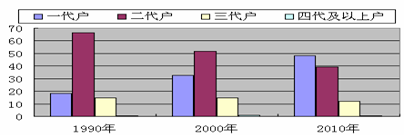 随着市场经济的发展,就业压力的增大,人们根据就业需求的迁移流动越来越频繁,再加上婚姻观念的改变和生育成本的提高,“单身贵族”和“丁克家庭”迅速增加,使得“一代户”比重上升快速。“四普”、“五普”、“六普”三次普查资料对比显示,我省“一代户”比重上升迅速,2010年达到48.23%,高于39.33%的“二代户”8.9个百分点,居首位。