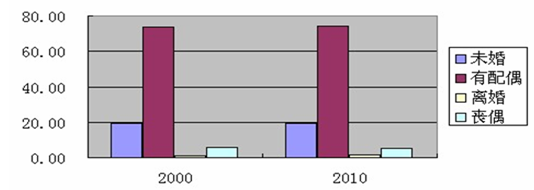 图1 2000年与2010年关于15岁及以上人口婚姻状况构成比较