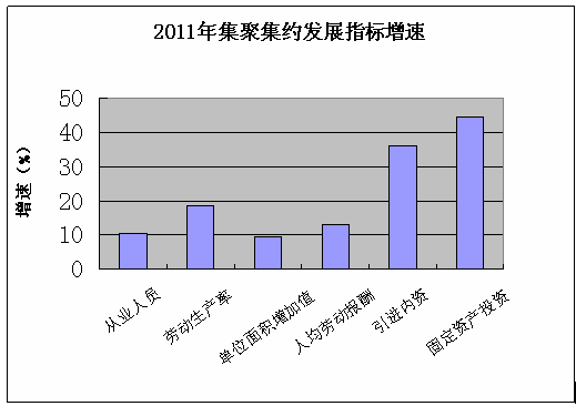 5.从建设进程看,开发力度不断加大。2011年,新开发土地建设面积共计53.4平方公里,占全部集聚区重点规划面积总量的5.4%;引进内资和实际到位外资分别比上年增长36%和13.1%,其中,新引进内资单个投资超亿元项目73个;固定资产投资比上年增长44.5%,增速比全省高19.7个百分点,其中基础设施投资比上年增长54%;新增投产企业185家。