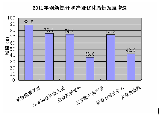 2.从产业结构看,“优新高特”产业较快发展。集聚区主导特色产业虽然以传统产业居多,但九大战略性新兴产业和现代服务业比重快速提高,“优新高特”产业发展迅速。2011年,14个集聚区工业新产品产值1104.8亿元,比上年增长36.6%,占工业总产值比重27.3%,比上年提高6.2个百分点,新产品产值占工业总产值比重比全省高5.3个百分点;服务业营业收入比上年增长73.2%;战略性新兴产业产值占工业总产值比重比上年提高5.4个百分点,一批以整车生产、临港制造、氟硅材料、电子商务等为主的现代装备制造业、新材料和新能源为主的一批战略性新兴产业快速发展。