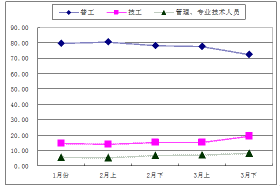 二、普工短缺现象有所缓解,而技工和管理技术人员缺工比例则有所上升,用工结构将得到逐步调整