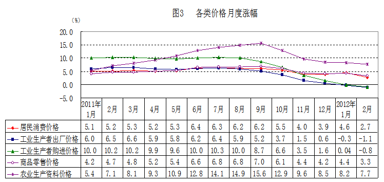 1-2月,商品零售价格同比上涨3.9%,其中1、2月份分别上涨4.4%和3.3%;农业生产资料价格同比上涨8%,其中1、2月份分别上涨8.2%、7.7%(见图3),涨幅均呈回落态势。