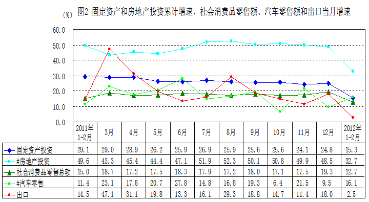 1-2月,全省固定资产投资1419.3亿元,同比增长15.3%,增速比去年同期回落13.8个百分点(见图2),其中,项目投资878.4亿元,增长6.7%。非国有投资1006亿元,增长25.2%,其中民间投资增长28.0%。在投资总额中,土地购置费249.2亿元,增长88%,拉动投资总额增长9.5个百分点,所占比重由去年同期的10.8%提高到17.6%。施工项目18107个,同比下降1.5%。其中,新开工项目1587个,增长7.8%,新开工项目计划总投资增长36.5%,完成投资168亿元,增长15.6%。产业投资增长平稳。一产投资增长1.5倍;二产投资增长9.4%,工业投资增长9.7%,工业技术改造投资增长4.2%,占工业投资的52.5%,制造业投资432.2亿元,增长15.9%,增速高于工业投资6.2个百分点(主要是工业投资中的电力投资大幅下降),装备制造业投资197.7亿元,增长8.3%;三产投资914.3亿元,增长18.5%,增速分别比固定资产投资和二产投资快3.2和9.1个百分点,但其中除房地产开发投资外的三产项目投资增长2.6%,低于固定资产投资12.7个百分点。房地产开发投资增速较高。房地产开发投资540.9亿元,同比增长32.7%,增速同比回落16.9个百分点,拉动固定资产投资总额增长8.3个百分点,土地购置费增长117.6%,所占比重达32.0%,同比提高12.5个百分点。基础设施投资下降9.1%,为286.6亿元,其中,广电、体育设施投资均增长1.2倍,教育、卫生设施和文化艺术业投资分别增长13.1%、21.5%和10.3%,水利和环境投资增长28.9%,而电力和水的生产和供应、电信和其他信息传输服务、交通运输、公共设施管理业投资分别下降31.4%、18.9%、19.1%和6.7%。