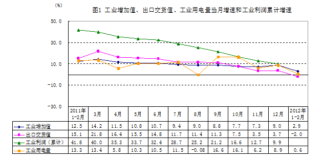 1-2月,全省规模以上工业增加值1399.1亿元,比去年同期增长2.9%,增幅比去年同期回落9.6个百分点,比去年四季度回落5.1个百分点,为2009年5月以来的新低。分行业看,轻、重工业增加值分别为625.6和773.5亿元,分别比去年同期增长6.3%和0.5%,增速比去年同期回落5.6和12.5个百分点;39个行业中15个行业增加值出现下降。分企业规模看,大型企业增加值增长5.7%,中型企业增长2.1%,小微企业仅增长1.4%。
