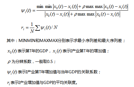 1.各产业增加值与GDP关联度的理论模型。根据本文研究需要,各产业增加值与GDP关联度的灰色关联度理论模型可以写成如下形式:
