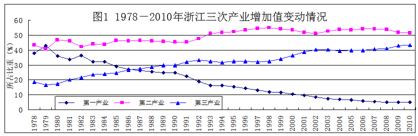 改革开放以来,浙江经济总量快速扩大,生产总值(GDP)跃居全国第四位,三次产业结构不断调整优化。从各产业增加值比重的变化曲线看,第一产业比重基本呈下降态势;第二产业增加值占比于1993年首次突破50%,此后基本维持在50%-55%之间,近几年又有所回落;第三产业增加值占比基本呈现持续上升的运行态势,并于2002年突破40%,其间也有部分年份出现小幅回调。总体上看,浙江三次产业构成自1987年后一直呈现“二、三、一”形态,近年来尚未发生根本变化,当前的产业结构正处于工业化向现代化的过渡时期。根据发达国家演进过程看,产业结构处于此阶段的时间相对较长,第二产业占主导经济格局在近期还将保持稳定。