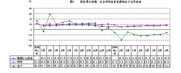 1.投资增幅持续回升。1-9月,全社会固定资产投资7132亿元,比去年同期增长14.3%,扣除投资价格因素,实际增长19.1%,实际增幅同比提高14.6个百分点,也比一季度和上半年分别提高6.4和1.2个百分点。限额以上投资6701.8亿元,同比增长14.9%,其中第三季度投资同比增长16%,增幅比一季度和上半年分别提高4.4和1.8个百分点,呈较强的上升势头(见图2)。从新开工项目看,投资增势较好。1-9月,限额以上投资新开工项目有11450个,其中亿元以上项目623个,同比分别增长30.4%和33.1%,新开工项目(不包括房地产)计划总投资增长50.6%。从投资投向看,一是工业及制造业投资增幅回升。二产投资3015亿元,增长8%,其中工业投资增长7.4%,工业技术改造投资增长9.5%,占工业投资的58.5%。制造业投资从5月份开始累计增幅转降为升,之后持续增长,1-9月,制造业投资2566亿元,同比增长5.2%,增幅分别比一季度和上半年提高7.1和2.4个百分点,30个行业中有17个行业投资处于增长状态,其中农副食品加工、烟草制品、印刷、化学原料、医药、橡胶制品、电气机械、废弃资源和废旧材料回收加工等8个行业增幅超过20%。在新开工项目中,工业项目占64%,其中技术改造投资增长40.6%。二是基础设施投资快速增长。基础设施投资1892.9亿元,同比增长23.2%;其中,比重较大的交通、电力、水利环境和公共设施管理投资分别增长35.5%、21.4%和17%;三是服务业投资成为投资新亮点。三产投资3649.7亿元,增长20.9%,如扣除房地产开发投资,则增长28.8%,明显高于限额以上投资平均增幅,其中,住宿和餐饮(40.6%)、金融(40%)、科研服务(68.5%)、公共管理和社会组织(36.3%)、计算机服务和软件(1.6倍)、文化体育和娱乐(1.1倍)、居民服务和其他服务业(1.5倍)等服务业投资增长较快。四是房地产投资稳步回升,销售快速增长。房地产投资1526.5亿元,增长11.4%,增幅比上半年提高1.5个百分点。商品房销售面积和销售额分别增长81.9%和112.7%,增幅比上半年分别上升30.2和30.3个百分点。五是一产投资增长较快,投资37.1亿元,增长56.9%。