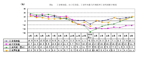 1.工业生产、出口、用电量和利润等主要经济指标持续回升。前三季度,全部工业增加值7283.8亿元,比去年同期增长3.4%,对GDP的增长贡献率为21.5%,拉动GDP增长1.7个百分点。规模以上工业增加值为5779.6亿元,同比增长3.0%,增幅比一季度和上半年分别回升8.6和2.7个百分点,其中,7月增长5.2%,略有回落,8、9月份分别增长7.6%和10.1%,且超过去年同期增幅,为今年以来各月的最高点,比1-2月回升18.3个百分点,回升速度之快超出预期,已连续6个月保持正增长。从2008年以来工业生产增速变动曲线看(见图1),今年9月份已接近去年6月份的水平,三季度已超过去年同期的水平,阶段性V型变动特征比较清晰。我省工业的回升幅度大于全国,工业增加值增长率与全国的差距由年初(1-2月)的低12个百分点快速缩小到8月份的低4.7个百分点,已逐步接近金融危机前的水平。
