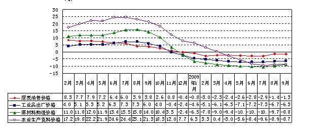 1-9月,工业品出厂价格和原材料购进价格同比分别下降6.3%和9.1%,8月份开始,结束了从去年11月以来连续9个月降幅加大的趋势,降幅首次出现收窄,分别下降6.7%和9.7%,9月份进一步降至6.3%和8.8%,降幅又比8月分别收窄0.4和0.9个百分点(见图3)。9月环比分别上涨0.3%和0.6%,已连续6个月环比上涨。1-9月,农业生产资料价格下降4%,其中9月下降8.7%。