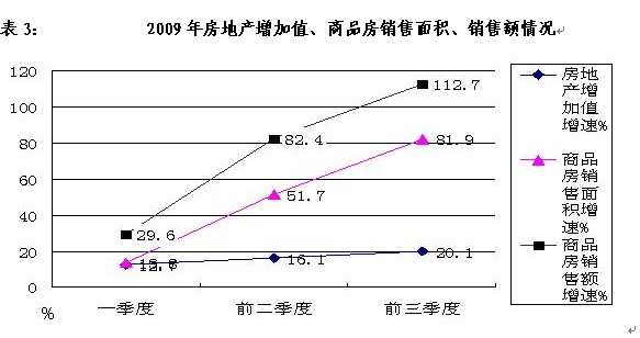 3.房地产市场加速升温。前三季度,全省房地产业实现增加值929.4亿元,同比增长20.1%,增幅比上半年提高4.0个百分点。商品房销售增势强劲,前三季度全省商品房销售面积3693.9万平方米,同比增长81.9%,增幅分别比一季度、上半年提高68.1、30.2个百分点;其中住宅销售面积增长88.1%,增幅分别比一季度、上半年提高73.5、32.1个百分点,办公楼和商业营业用房销售面积分别增长41.1%和43.3%,增幅比上半年提高14.1%和29.5%。随着下半年房地产市场的持续升温,房地产价格居高不下,新建房的房地产环比价格指数由6月份的101.2升到了9月份的102.1。前三季度商品房销售额2808.0亿元,同比增长112.7%,增幅分别比一季度、上半年提高83.1、30.3个百分点。