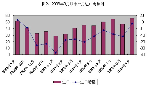 1.进口转降为升。9月份,全省进口总额55.9亿美元,同比增长7.7%,自去年11月份以来首次实现正增长。增幅比1月份的-36.8%回升44.5个百分点,比6月份的-2.4%回升10.1个百分点。从进口月度规模看,今年进口月度规模呈逐月扩大的走势,6月份进口总额(50.5亿美元)超过了去年月均水平,到9月份进口总额再创今年月度规模最高值,从6月份开始月度规模已连续4个月超过了去年月均水平(见图2)。
