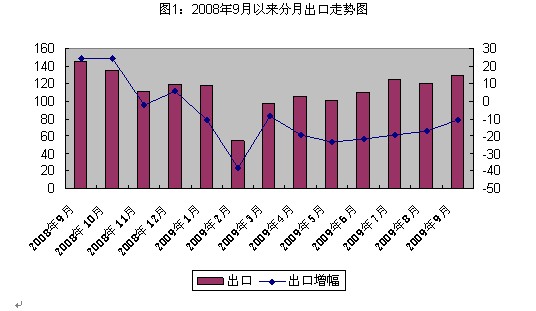 5.劳动密集型商品出口跌幅缩小。受国家调高纺织服装出口退税和减免纺织服装产品出入境检验检疫费等多重政策迭加刺激,我省纺织、服装、箱包和家具等传统商品出口跌幅缩小,明显小于总体出口。前三季度全省纺织服装出口294.9亿美元,同比下降8.4%,降幅较上半年缩小0.8个百分点;家具、箱包、床上用品等出口分别下降8.4%、16.7%和10.9%,均小于全省平均降幅;而鞋类出口首次逆势出现正增长,同比增长1.02%。同期,全省机电产品、高新技术产品出口继续大幅下降,同比分别下降23.8%和35.9%,降幅均明显大于全省平均水平。值得一提的是,船舶和塑料制品出口一直保持增长势头,成为我省出口亮点,增幅分别为26.5%和6.2%,较前8个月分别上升4.6和0.4个百分点。