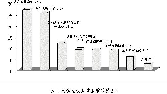 当前,全国劳动力供大于求的状况将长期存在,但随着经济结构的调整,就业结构性矛盾也随之凸显。大学的连年扩招导致大学生“过剩”,以及金融危机引起的大学生就业岗位减少,供求双方的落差成为影响大学生就业的主要因素。调查显示,有25.5%的人认为大学生人数太多导致现在大学生的就业困境,还有12.2%的人认为金融危机引起的就业岗位减少是大学生就业难的主要原因。