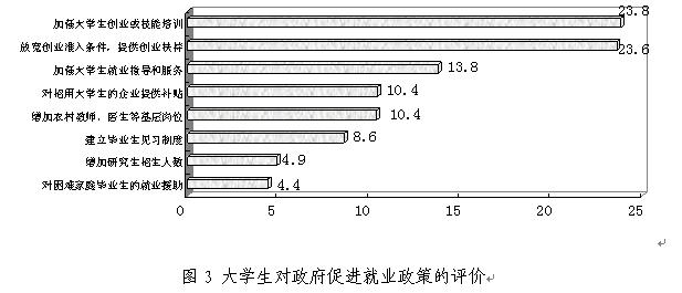 调研中一个突出的现象是大学生对用人单位的需求不了解,对自身的职业规划比较模糊,有13.8%的大学生希望政府能够“加强大学生就业指导和服务”,其中未找到工作的大学毕业生对这一措施需求尤为强烈。