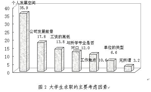 调查发现,毕业生已逐步改变了择业首要因素,只有10.6%的受访者选择工作地点,6.6%的选择单位类型作为首要因素,位于所有选项的末两位,而有35.9%的受访者选择个人发展空间作为择业时首先考虑的因素,17.8%的受访者选择公司发展前景作为首要因素。由此可见,在大学生供给日益增多的背景下,面对严峻的就业压力,现代大学生的选择趋于理性化,不再拘泥于在经济发达地区的传统行业领域里谋求一份工作,树立起“先就业后择业”的务实态度,把长期职业发展摆在了第一位。