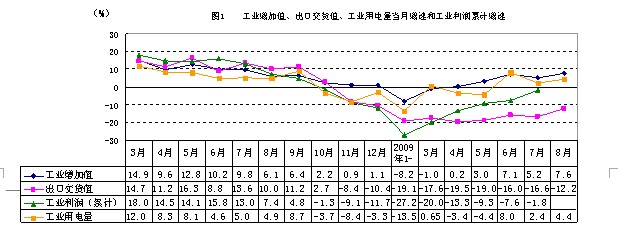 8月份,浙江经济运行延续了企稳回升的积极向好态势,工业生产、用电量、投资、消费等主要经济指标增长率在7月份略有回落之后又出现回升,且大部分指标超过6月份的高点,出口降幅继续收窄,财政收入持续增长,新增贷款略多于上月,市场价格或已出现见底回升的拐点。