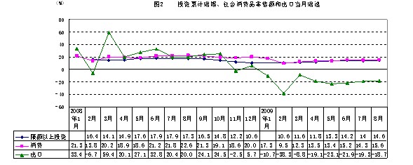 3.投资增幅进一步提高。8月份,限额以上固定资产投资为861.2亿元,同比增长18.3%,增幅分别比6、7月提高1.5和5.3个百分点,环比增长5.2%。1-8月,限额以上投资5786.6亿元,同比增长14.6%,增幅比上半年和1-7月分别提高0.4和0.6个百分点(见图2),其中,基础设施投资1632.9亿元,同比增长29.7%,增幅比1-7月提高4.1个百分点;制造业投资2214.4亿元,增长4.2%,增幅比1-7月提高1个百分点;房地产投资1327亿元,增长10.7%,增幅比1-7月提高1.6个百分点。商品房销售面积和销售额分别增长74.1%和107.4%,增幅比1-7月分别上升6.9和9个百分点。限额以上投资新开工项目有9961个,同比增长26.9%,新开工项目计划总投资增长39.1%。